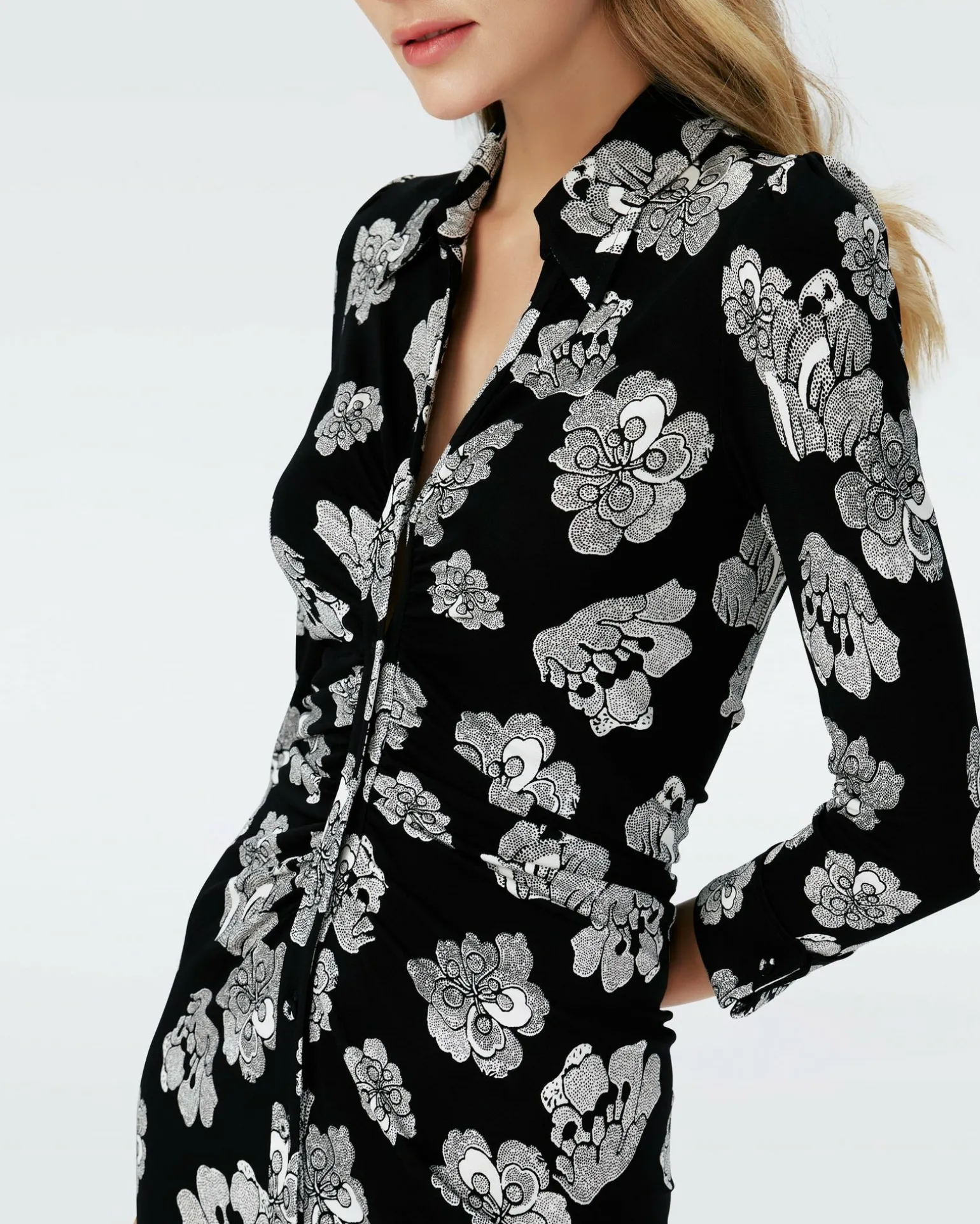 Sleek And Simple, The Sheska Is A Fitted, Knee-Length Shirt Dress. This Piece Has A Classic Collar, Sleeves That End In Folded Cuffs, Buttons That Run Down Its Center, And Ruching Along The Bodice. Made From A Matte Jersey, It Has A Smooth, Clean Finish.