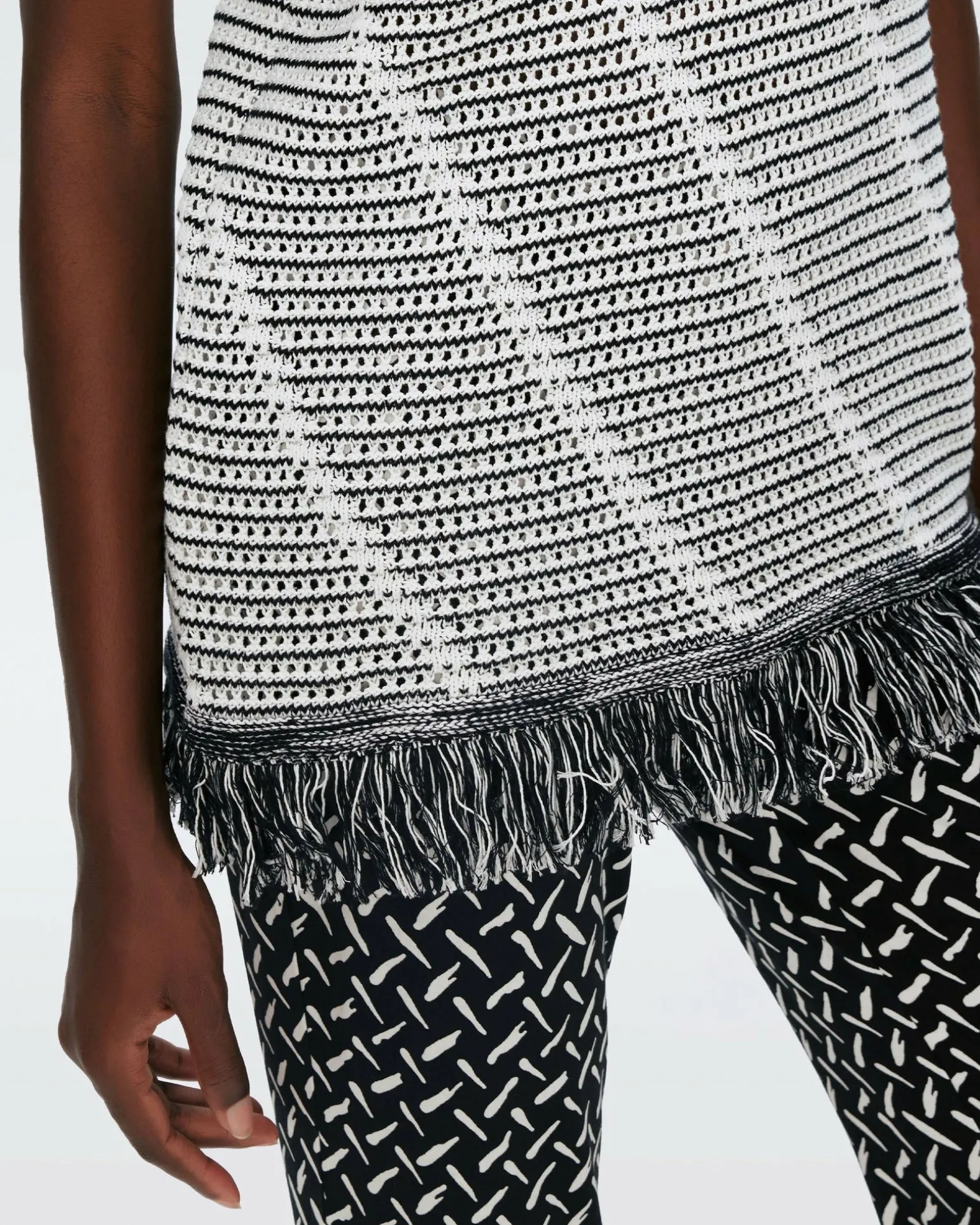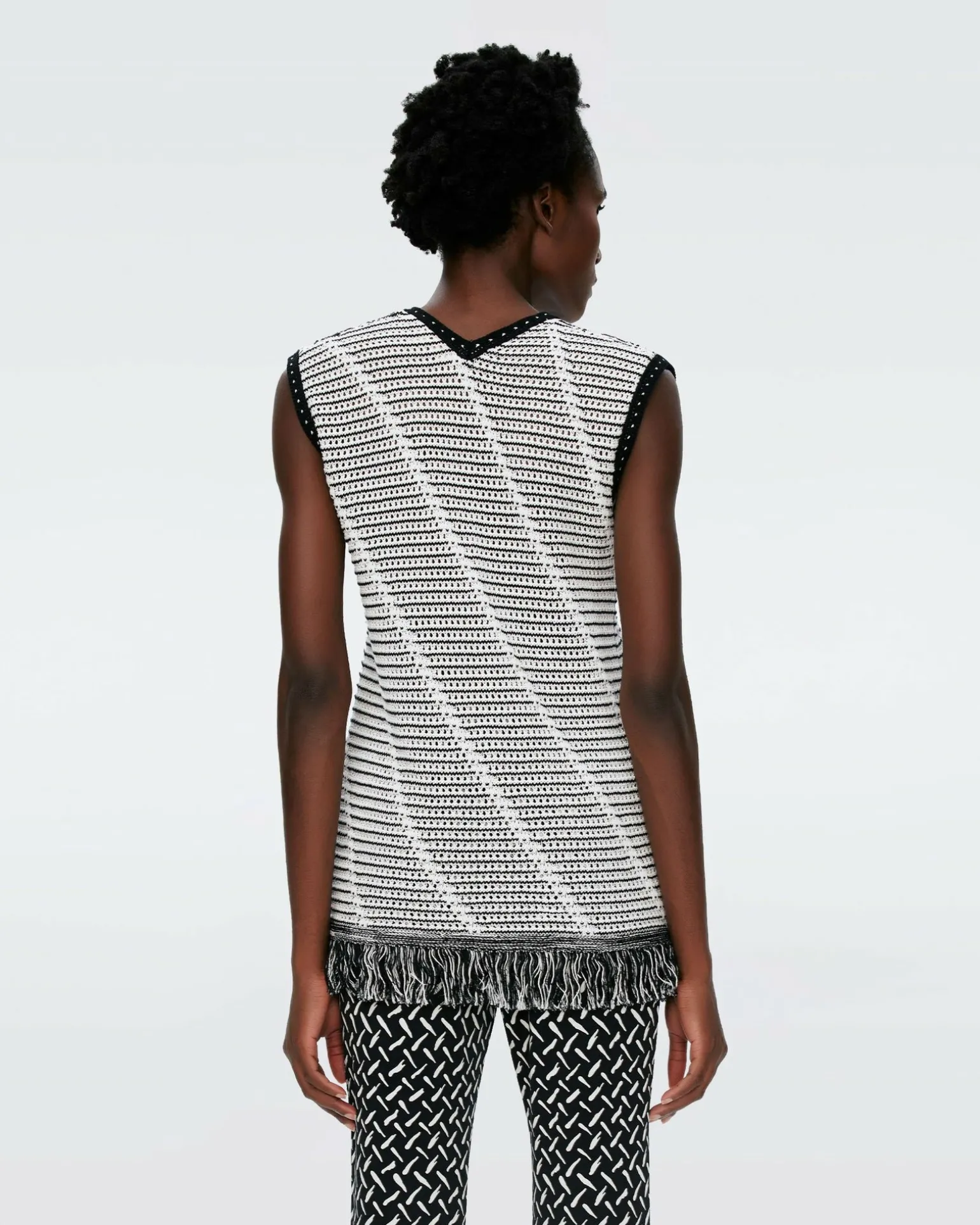 Made From A Cotton Crochet, The Styles Top Has Detail And Texture. This Sleeveless Piece Has An Easy Shape And A Fringed Hem. Contrasting Solid Detail Features At The V-Neckline And Arms.